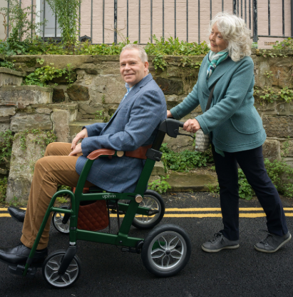 In de rolstoelstand biedt de Glide een comfortabele zitting met een stevige, zachte rugleuning. Ideaal voor rustmomenten onderweg. De ergonomische handgrepen zorgen voor een prettige houding tijdens het lopen en maken het voor een begeleider eenvoudig om te duwen en te sturen.